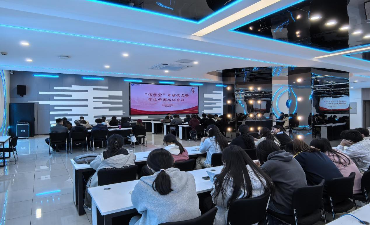 3月27日下午,ac米兰官网中文网站举办“信”学堂开班仪式暨学生干部培训会议。学院党总支副书记(主持工作)尹仕果、学院党总支副书记江寅昌、全体辅导员、在校班级学生干部共同参与此次活动。
