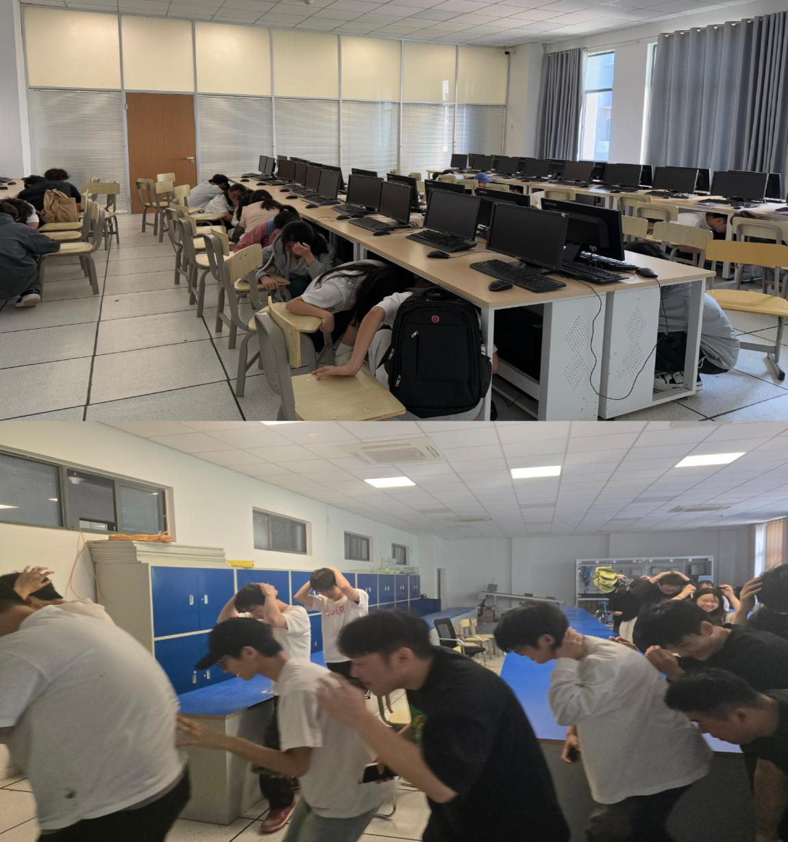 15点40分,随着第一声警报响起,演练正式开始。各班级迅速进入应急状态,各班学生立即用书本或手臂护住头部,就近躲避在课桌下方或教室三角区域。一分钟后,第二声疏散警报拉响,学生在辅导员的指挥下,弯腰低身、双手护头,按照既定的疏散路线快速撤离。整个疏散过程紧张而有序,展现良好纪律性。