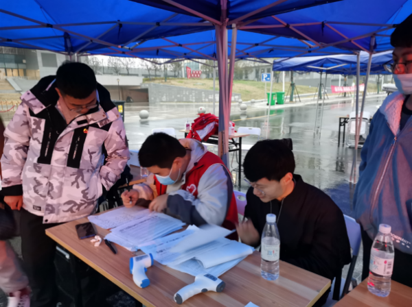 当天下午开始下雨,雨水沿着帐篷边沿不注的下落,地面潮湿,然而学院的老师和志愿服务的同学们一直坚守在岗位上,热情地迎接着每一个返校报到的学生,直到幕色降临……当天共有1545名学生返校,双休日仍有同学陆续返回。