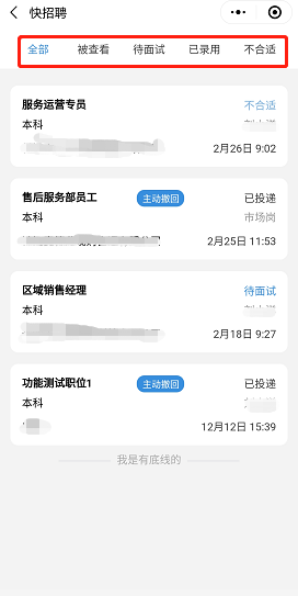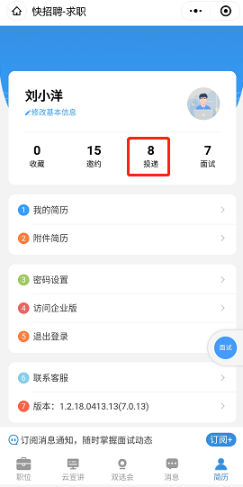 简历投递后的进度查看,点击“简历”-“投递”,可查看简历的处理进度及反馈。
