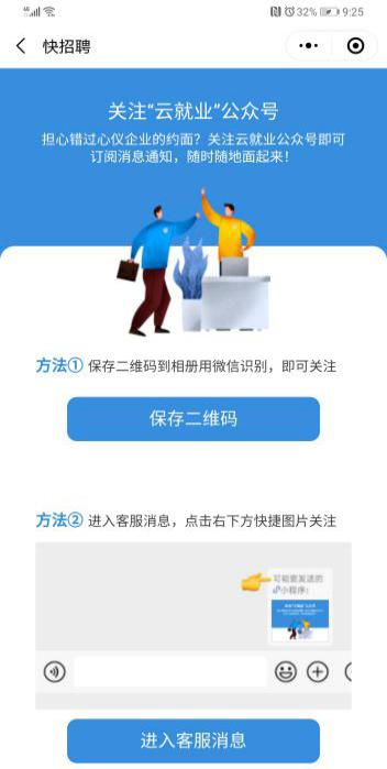 注册登录后,点击底部栏目“我的”,进入后选择“我的简历”制作并完善简历。在简历中心点击“订阅”按钮,识别二维码关注“云就业”公众号即可接收面试信息通知推送,关注后返回小程序会场。