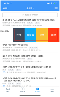 第四步:将手机端上下载的文献分享到电脑端,下载完成的文献在资料库中,在对应的文章上左划即可对下载的文献进行分享等操作如下图: