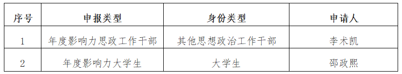 根据湖南省教育厅《关于开展湖南省高校思政工作年度影响力人物推选活动的通知》,伟德官网组织开展了湖南省高校思政工作年度影响力人物项目申报工作,共有一人申报年度影响力思政课教师,三人申报年度影响力思政工作干部,一人申报年度影响力大学生。经专家评审,落实《通知》中“坚持培优选优,宁缺毋滥”的原则,拟推荐李术凯申报年度影响力思政工作干部,邵政熙申报年度影响力大学生。现将拟推荐人选情况公示如下:
