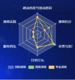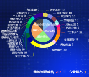 二是德育得分形象直观。考评系统根据学生德育学分的来源,自动生成德育综合评价得分结构图,包括饼状图和雷达图,实现德育学分可视化。其中,饼状图可以描述学生德育综合评价加分、减分项目的来源;雷达图可以呈现学生德育学分的强项、弱项和级别;