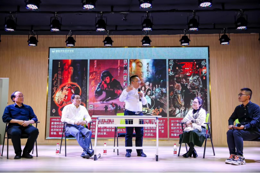 在主持人鞠晨曦的引导下,四位主讲嘉宾分别对《大话西游之月光宝盒》进行了专业评论,由王东老师起头,用电影经典台词引起讨论,并发表自身看法,通过与同学代表的互动提升了现场氛围。谢雨老师从打动她的“一滴泪”娓娓道来,从浪子——爱情的人物性格转成再一次把现场氛围推向高潮,引起同学代表的共鸣。冯健飞主任对于周星驰电影体现的后现代解构以及解读经典的“三步法”也引起大家的共鸣。嘉宾们的思想碰撞让台下学生对周星驰的电影特色有了进一步的了解。最后谢子元主席通过时代的不可复制性,以“周星驰的电影真的能被称作经典吗?”的反问将讨论转变为思考,把座谈带到另一个思维层面……