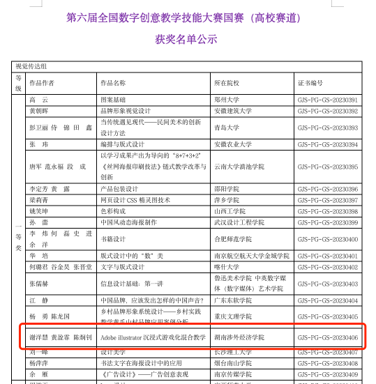 近日,第六届全国数字创意教学技能大赛国赛获奖名单公示,伟德官网人文艺术学院网络与新媒体系教师谢洋慧、黄盈霏、陈炯钊组成的课程组获得高校赛道视觉传达组一等奖。