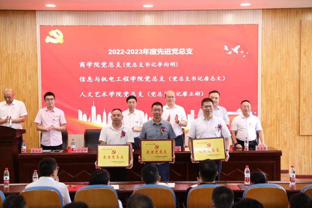 党委副书记、校长王耀中宣读了《关于表彰2022-2023年度先进基层党组织、优秀党务工作者和优秀共产党员的决定》和《关于公布全省高校党组织“对标争先”建设计划第三批项目评选结果的通知》。校领导为获奖集体、个人代表颁发了奖牌和荣誉证书。