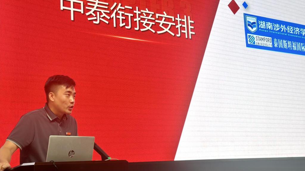 杨建波介绍了出席的各位领导与嘉宾并对他们的莅临表示诚挚欢迎。锁璐博士与叶艳导师分别就泰国斯坦福国际大学的专业课程体系进行详解,涵盖学校概况、校区设置、师资力量及校园活动等内容;许二鹏院长解读了中泰实验班培养方案,他结合自身在泰国斯坦福国际大学的求学经历,生动展现泰国的友善文化与风土人情。