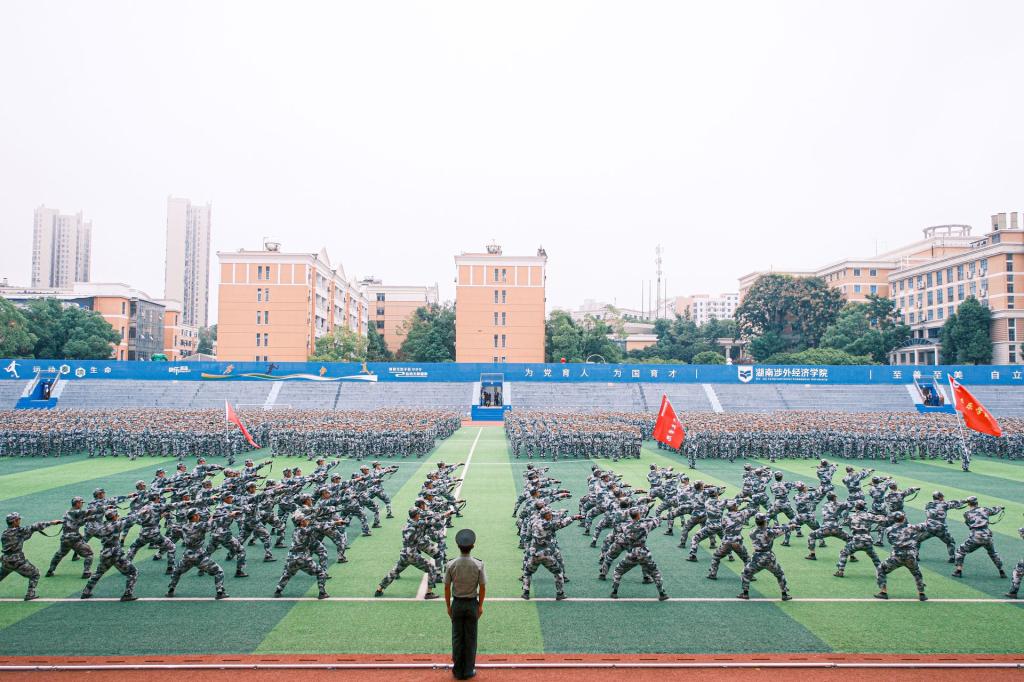 伴着激昂雄壮的乐曲,分列式正式开始。护旗手迈着整齐划一的正步,稳步走过主席台,受阅方阵精神抖擞、斗志昂扬,步伐坚定有力,口号高亢嘹亮,气势豪迈地依次通过主席台。刺杀操、匕首术、棍术等表演动作干净利落,气势如虹,赢得现场阵阵掌声,充分展现出2025级新生朝气蓬勃、昂扬向上的精神风采。