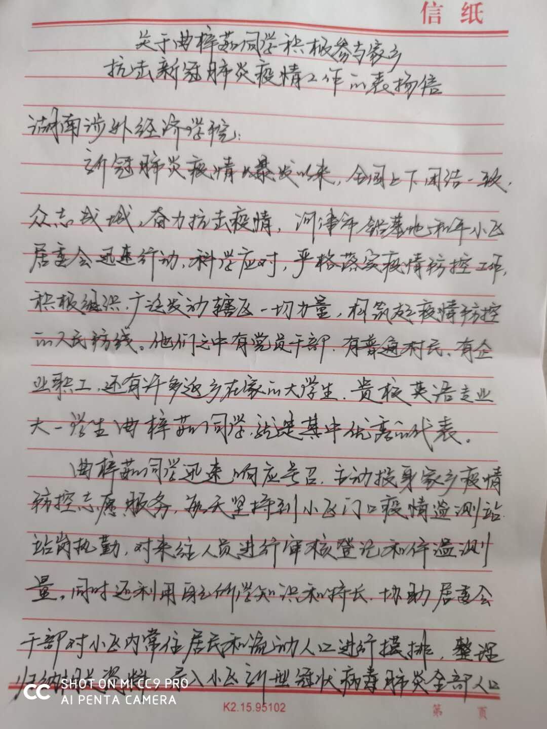 信中表示,在小区疫情防控工作人员紧缺时期,曲梓茹同学积极响应号召,主动投身家乡疫情防控志愿服务,每天坚持到小区门口疫情监测站站岗执勤,对来往人员进行审核登记和体温测量,同时还利用自己所学的知识和特长,协助居委会干部对小区内常住居民和流动人口进行摸排,整理归纳相关资料,录入小区新型冠状病毒肺炎全部人口排查电子登记表,帮助小区建立了底数清、数字准、情况明的联防联控工作台账,为疫情防控贡献了自己的力量。