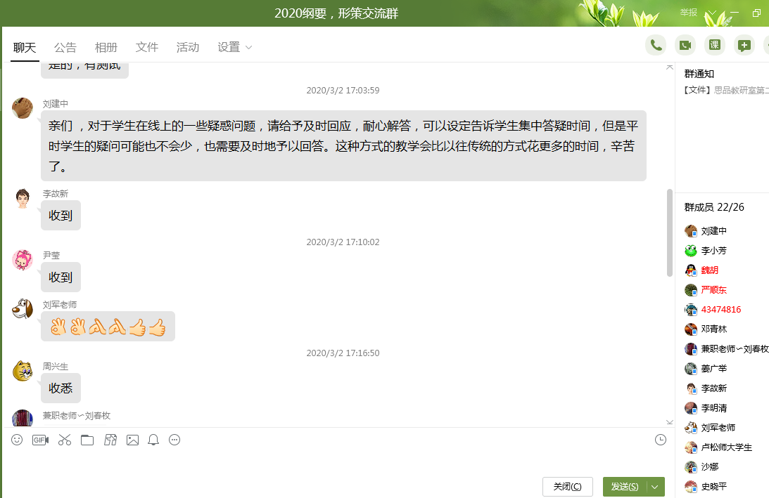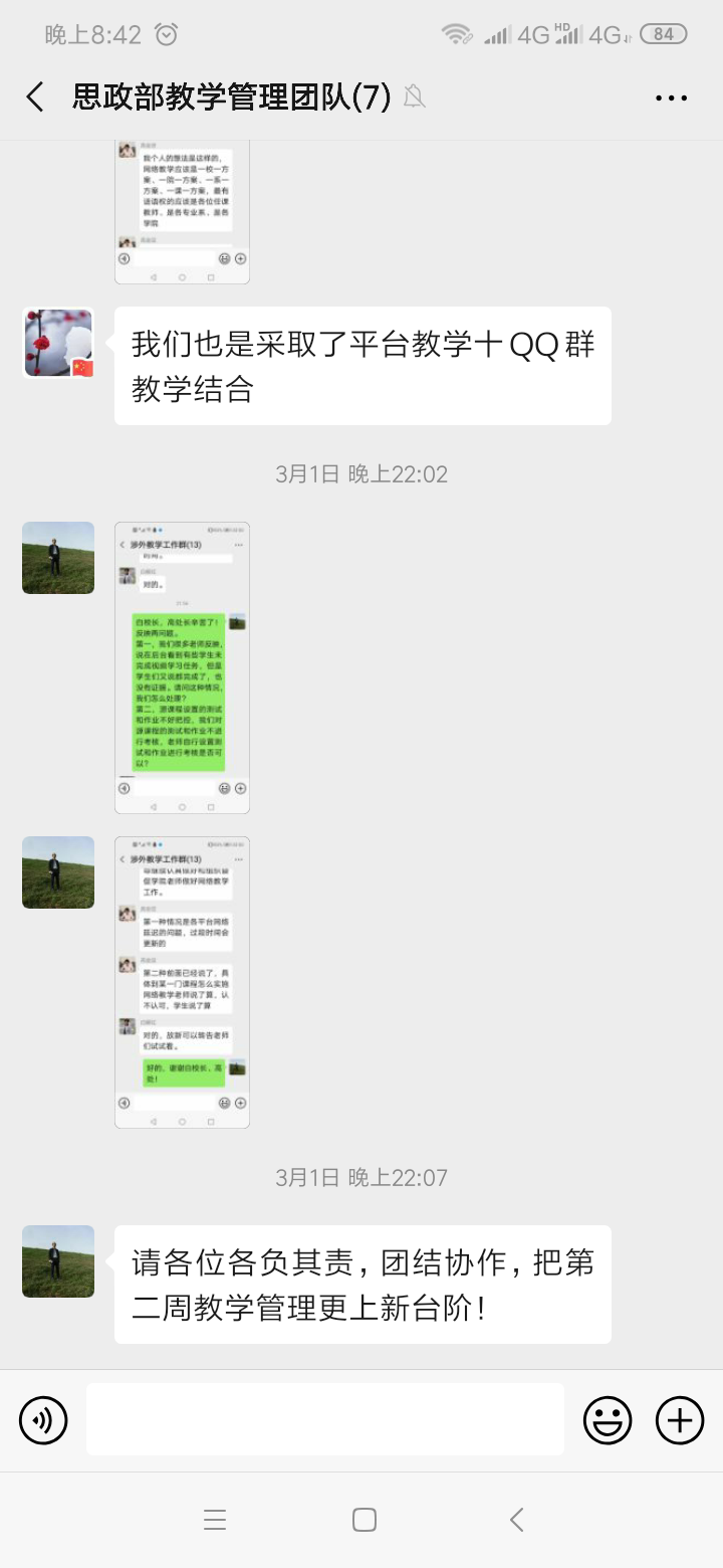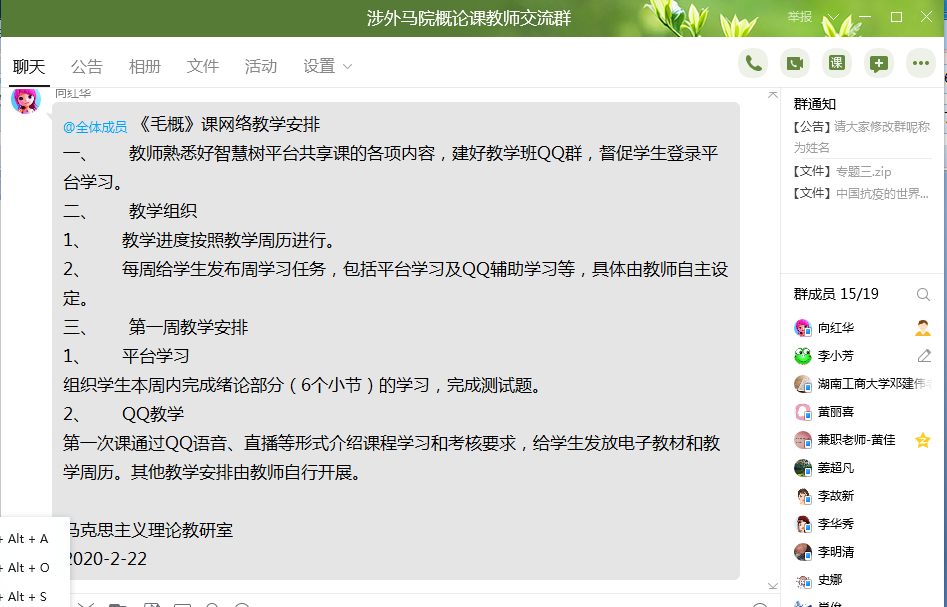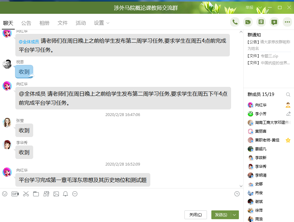 按照学校“停课不停学、不停教”的统一部署和要求,马克思主义学院成立了疫情防控期间教学工作小组,由周仲秋院长担任组长、李故新副院长担任副组长,各教研室主任任成员,周密部署、制定详细的网络教学方案并指导实施。