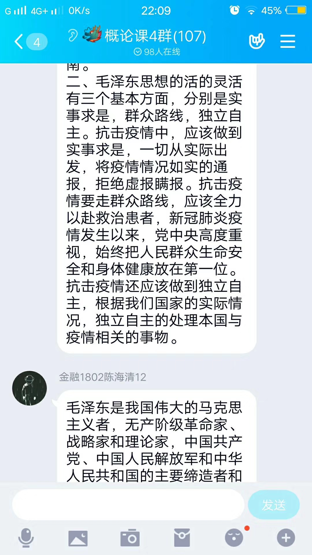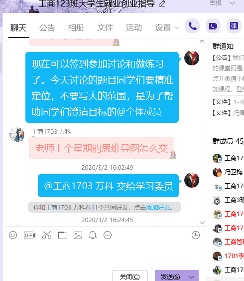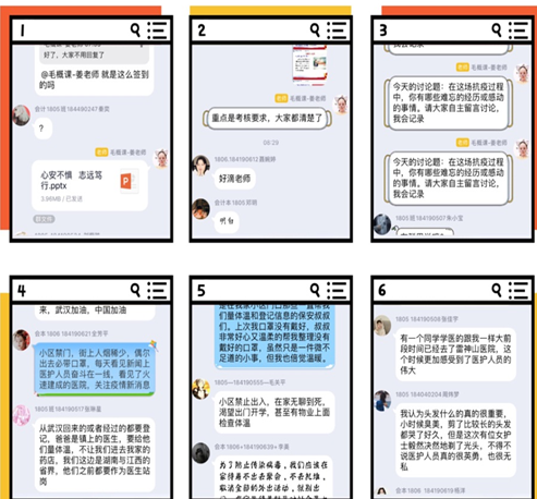 课堂上,组织学生签到、介绍课程内容、说明考核要求、观看教学视频和课件、组织学生讨论、线上答疑、总结发言等各环节环环相扣。刘春枚老师采用慕课视频打卡的方式确保每一位同学能按时上课;李故新老师要求学生提交同步学习的图片以便及时掌握学生的学习状态;姜莉老师在开学第一课上向同学们介绍在抗击新冠肺炎防疫战中涌现的先进人物的感人事迹,用生动的案例激发同学们的责任担当;姜超凡老师课后及时收集学生对网络教学的意见和建议以便及时改进;各种线上答疑也是时时进行中。