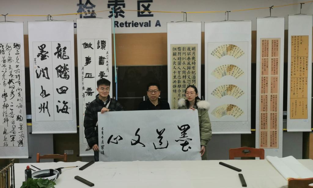 开幕式结束后,在刘宇洁会长的引导下,众来宾移步至图书馆观看作品展。篆隶草行楷,笔走龙蛇,入木三分。现场除了有已完成的作品展示外,还有现场书法比赛。各参赛选手端坐桌前,凝神聚气,一心沉浸在书法的世界中,将自身修养与对人生之感悟都一笔一画地书写在面前的这张白纸上。他们的作品或沉稳或灵动,一撇一捺之间,尽显人生体悟。