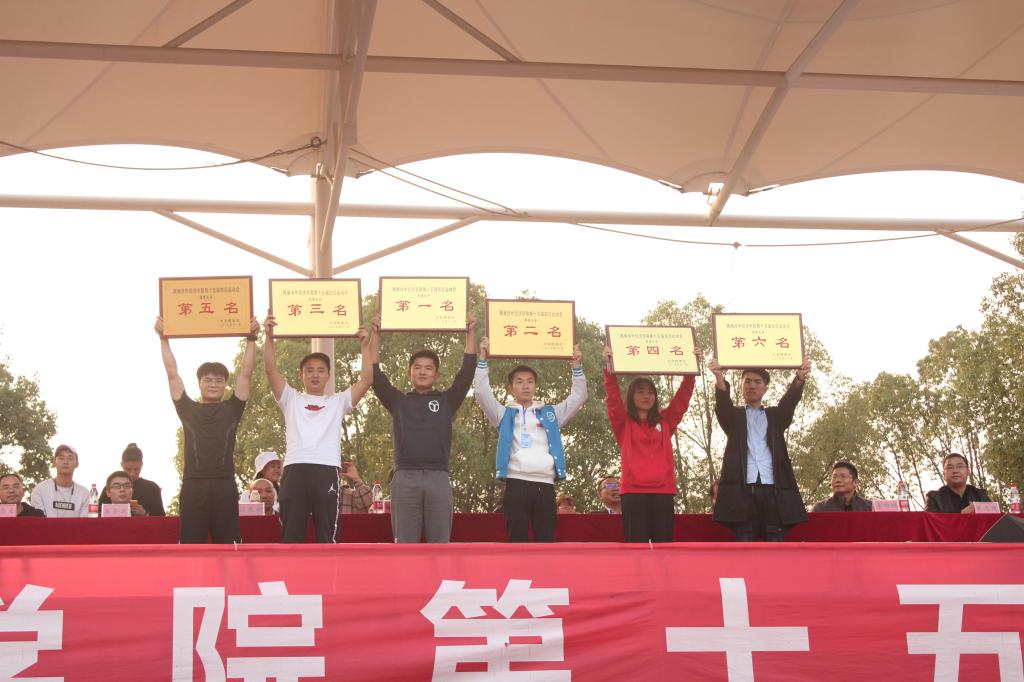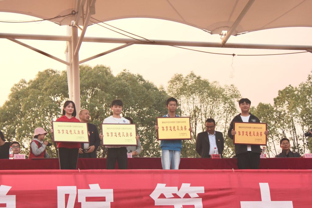 伴随着庄严的国歌声,闭幕式正式开始。首先,本届运动会总裁判长刘雪勇教授宣布比赛总成绩:体育学院以团体总分463分夺得桂冠,商学院和信息与机电工程学院分别获得亚军和季军。随后,汪东明副校长宣布了体育道德风尚奖获奖名单:外国语学院、信息与机电工程学院、继续教育学院及音乐学院。22名老师和32名同学获得优秀裁判员和优秀运动员的称号。白解红副校长、鞠晨曦副校长、汪东明副校长等领导嘉宾为获奖单位颁奖。