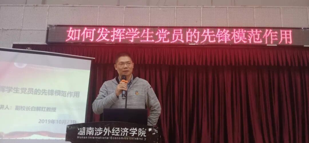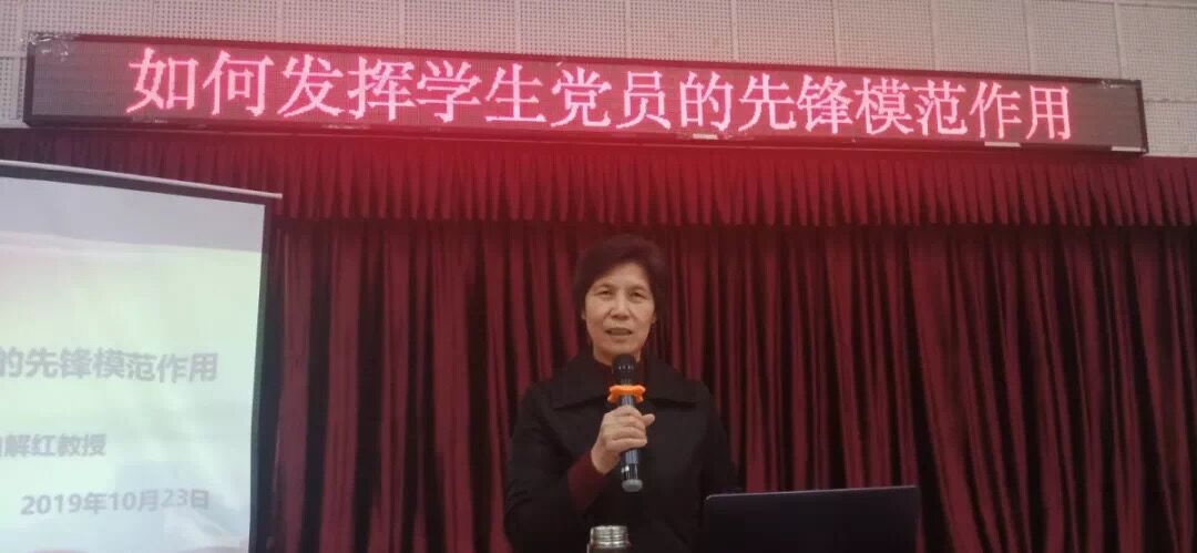 白解红副校长指出,作为学生党员,要想在思想上发挥先锋模范作用,就要切实提高自己的思想政治素养,深入学习马克思列宁主义、毛泽东思想、邓小平理论、“三个代表”重要思想、科学发展观、习近平新时代中国特色社会主义思想;学习党的路线方针,学习党的基本知识,学习科学、文化、法律及业务知识,不断加强理论修养,树立正确的世界观、人生观、价值观。她说,学生的核心任务就是学习,要做到树立远大理想、刻苦学习、努力实践、勇于创新、敢于挑战、积极主动学习课外知识,拓宽眼界和思路。要有强烈的责任感和荣誉心,认真做好每一件小事,真诚对待每一位同学,在同学中树立起一名党员的良好形象。生活上关心同学,团结同学,勤俭节约,艰苦朴素,反对铺张浪费,树立良好的生活作风,养成良好的生活习惯,从身边小事做起,从点滴做起 。她对如何发挥学生党员先锋模范作用提出具体要求:要带头遵纪守法。遵守校规,不借贷,诚信待人,做优秀的共产党员;要带头勤俭节约;要带头学会感恩。感恩国家、社会、师长、父母、爱护和关心自己的人;要带头助人为乐;要带头热爱劳动。参加社会实践,丰富人生阅历,磨练意志和品格;要带头学会珍惜;要带头努力奋斗。