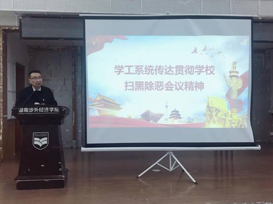 随后,邝继红处长传达了学校扫黑除恶专项斗争部署会议精神。他指出,扫黑除恶事关人心向背和基层政权巩固,事关进行伟大斗争、建设伟大工程、推进伟大事业、实现伟大梦想。伟德官网扫黑除恶工作的重点在于从网络诈骗、校园贷等方面进行摸排,各二级学院要积极宣传开展扫黑除恶专项斗争的重要性、必要性,提高师生的安全意识和参与扫黑除恶专项斗争的热情,切实把扫黑除恶专项斗争做实做细做出成效,保障校园和谐稳定。
