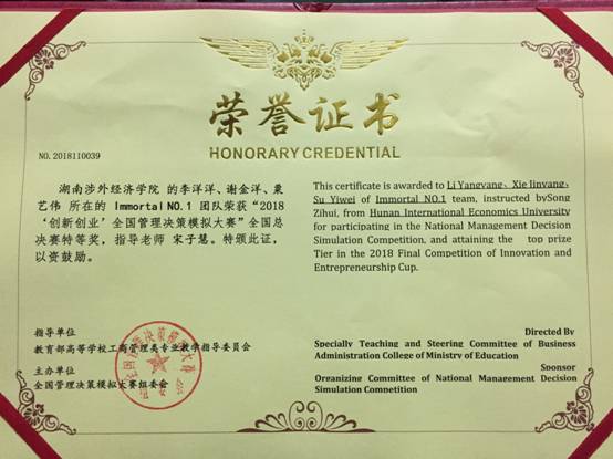 2018年11月11日,伟德官网管理学院李洋洋、谢金洋、粟艺伟组建的“Immortal NO.1”队在宋子慧老师的指导下,喜获创新创业全国决策模拟大赛特等奖。管理学院以培养应用型人才为教学的宗旨,此项学科竞赛的成果正是这一宗旨的最好印证,也是学院大力支持的结果。