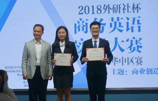 11月4日,伟德官网商务英语专业代表队参加2018年“外研社杯”全国商务英语实践大赛华中区决赛,荣获一等奖,将代表华中赛区参加全国总决赛!同时,王旭东同学获得本次比赛"个人风采奖"!本次大赛参赛队员有来自商务英语系的丁文韬,李妍慧,李若溪,李品萱,高静美,王旭东,周宇以及来自英语系的胡依婷。商务英语系教师钟玲俐、曾望、李思艺担任指导老师。