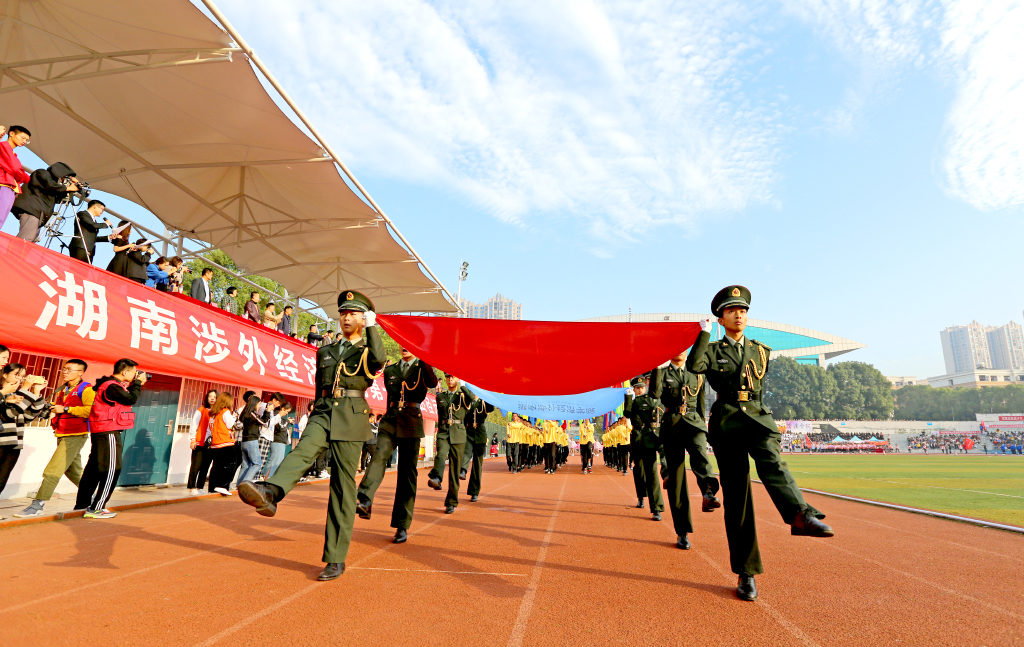 伴着激昂的《运动员进行曲》,国旗护卫队队员托举着国旗与校旗步入会场,彩旗方阵、鲜花方阵、裁判员方阵以及各二级学院方阵紧随其后。旗风呼啸,他们以整齐的步伐为国旗增辉,以响亮的口号为校旗添彩。