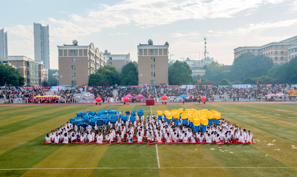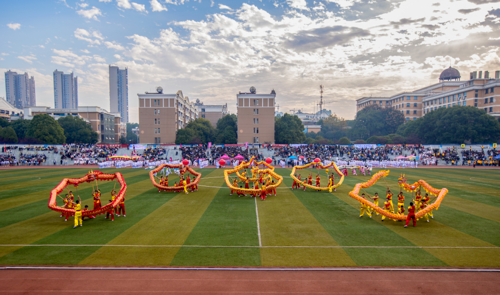 龙腾涉外,宇华腾飞,筑梦前行,扬帆起航。在阵阵鼓声后,团体操表演闪亮登场。蛟龙起舞,沸腾全场,寄托涉外师生新希望,开拓宇华跨越发展新征程;红旗飘扬,盛世欢歌,构筑涉外师生新梦想,打造宇华新时代新奇迹;武韵民魂,刚柔并济,一腔热血,始礼终礼,树立涉外师生新自信,谱写宇华新篇章。