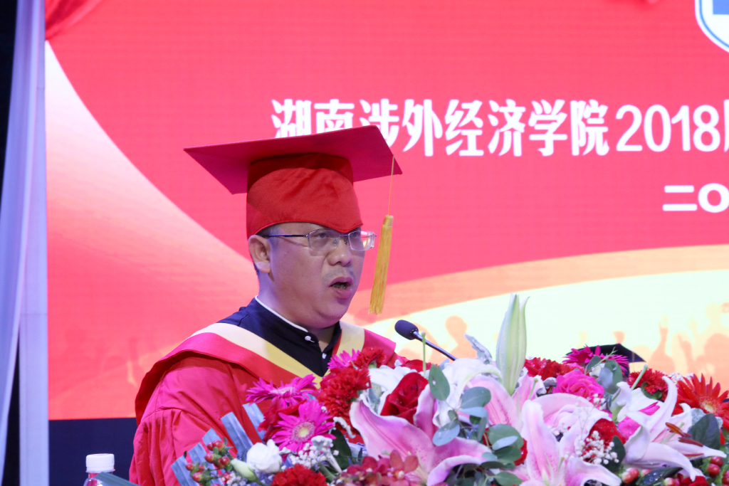 王耀中校长在致辞中对即将离校步入社会的毕业生们表达了深深的祝福。他说:“习近平总书记曾于今年五月在北京大学师生座谈会上说道:幸福都是奋斗出来的,奋斗本身就是一种幸福。这不仅是习近平总书记对北大学子和全国青年的要求和期望,同时也是我对你们的寄语。青年需励志,立鸿鹄志,做奋斗者。为实现中华民族伟大复兴的中国梦而奋斗,是我们人生难得的际遇。每个青年都应该珍惜这个伟大时代,做新时代的奋斗者。譬如我们的优秀学子陈帅峰和杰出校友朱增辉,他们只是数万名奋力拼搏的涉外学子中的一员,但他们的故事揭示着同一个道理——不管你身处人生的高峰还是低谷,命运终究需要掌握在自己的手中。热血澎湃、充满朝气的青春岁月,惟有奋斗方能‘不负韶华不负卿’!”