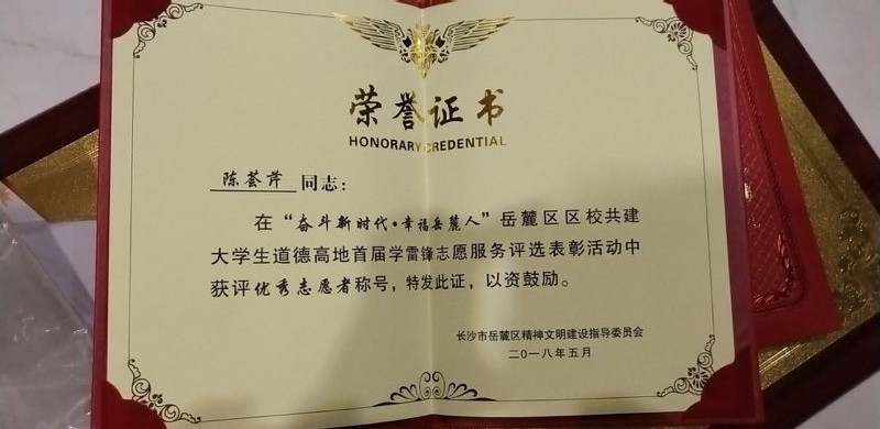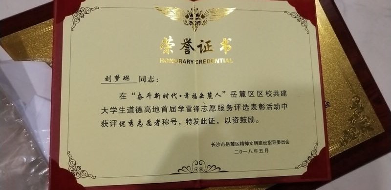 为进一步加强公民道德建设,积极培育和践行社会主义核心价值观,广泛动员辖区大学生参与区校共建大学生道德高地活动。以学雷锋志愿服务常态化和制度化为目标,贴近实际、贴近生活、贴近群众,积极开展城市管理、义务帮教、法律咨询、文艺演出、医疗卫生、敬老扶残等学雷锋志愿服务活动,涌现出一大批学雷锋志愿服务先进典型。为表彰先进,树立榜样,经各单位推荐,严格评选,长沙市岳麓区文明委决定:授予刘梦琳同志“区校共建优秀志愿者”称号,授予陈荟芹同志“区校共建优秀志愿者”称号,授予BV伟德官方网站SFYou助学会“优秀志愿服务组织”称号。希望受表彰的集体和个人珍惜荣誉,再接再厉,在校共建工作中更好发挥示范带动作用,为建设“知识岳麓”“创新岳麓”作出新的更大贡献!