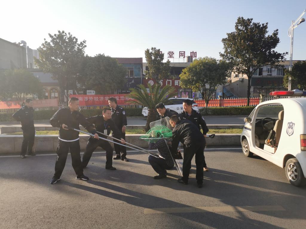 为进一步加强安全保卫人员面对突发暴恐事件的防范意识,不断提高应对突发暴恐事件的处置能力,最大限度减少因暴恐事件对师生造成的伤害,积极确保全校师生安全与正常教学秩序的开展,安全保卫处根据主管校领导要求,于10月21日下午3时许,联合高新区公安分局麓谷派出所,在校南门开展了一场反恐防暴演练。汪东明副校长高度重视本次反恐防暴演练,并全程予以指导。
