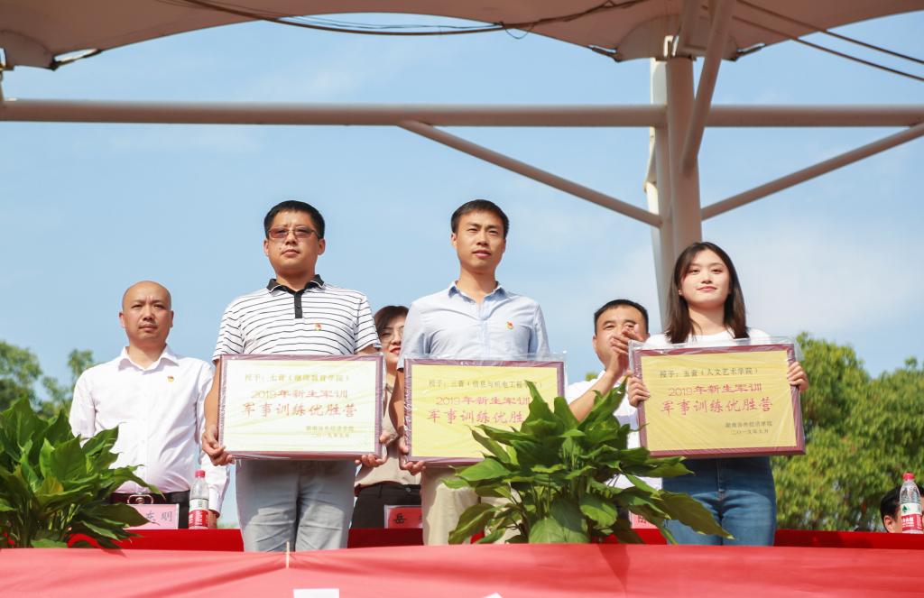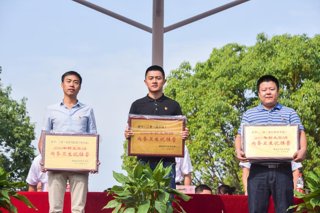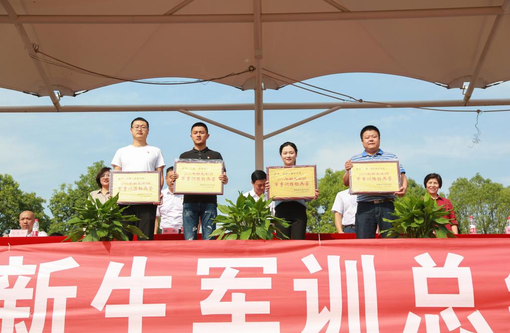 陈斌副校长宣读《关于表彰2019年新生军训先进集体及先进个人的决定》。授予优秀先进集体“军事训练标兵营”“军事训练优胜营”“内务卫生优胜营”等荣誉称号,向成绩显著的个人授予“优秀军训专干”“优秀指导员”“优秀教官”等荣誉称号。