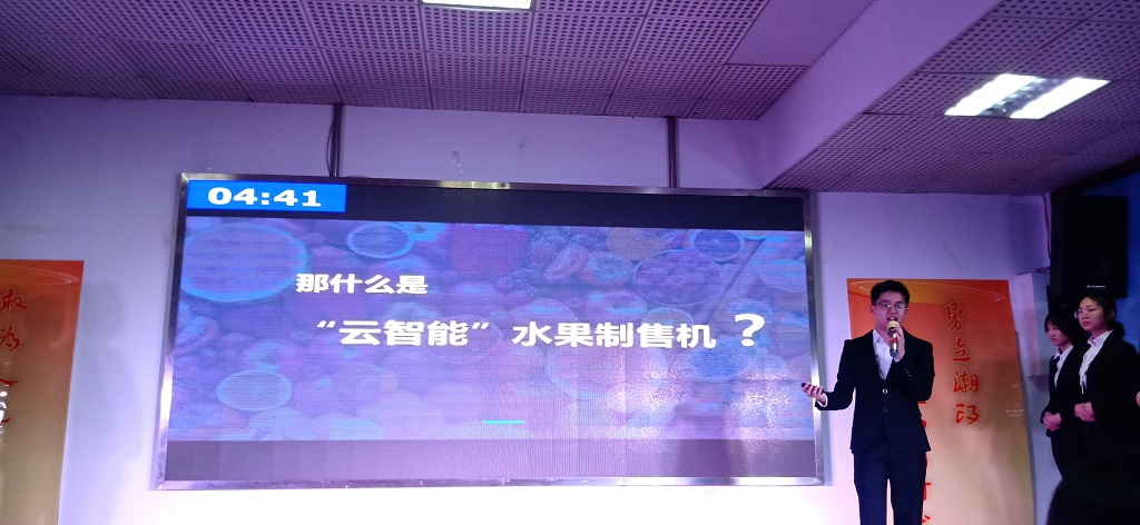经过激烈的角逐,共有11支团队进入决赛。首先展示的是“社志通”团队,他们经过调研得出结论:社区居家养老是适应我国老年化日趋严重、家庭养老功能弱化、机构养老不受欢迎的国情,有政府的大力支持,且老年人满意度高。为缓解第三方运营中的资金压力,实现社区居家养老的可持续发展,他们创建了“社志通”社区居家养老服务与志愿服务共享平台,以便更好的帮助老人。他们献身公益、传递爱心的良好品质,也赢得了在场评委的赞扬。紧接着是“云智能水果制售机”团队上台展示成果。他们发现在市场上,水果消费总量在快速增长,预见了水果及其加工产业良好的发展前景。随着5G时代的到来,无人零售市场日趋火热,他们研发出“云智能水果制售机”投放市场,利用信息通信技术以及互联网平台,让互联网与传统行业深度融合,更好的满足了人们的对水果日益增长的消费需求。“基于物联”团队虽然在上台展示过程中不足够惊艳,但令人眼前一亮的是,他们将研发的暖风机产品带到了现场,给在座的评委老师亲身感受。评委老师王志成对此产品表现出极大的兴趣,他围绕“深入研发”、“找主战场”、“将共享转为基本定向投放”三方面,对团队给出了专业角度的建议。