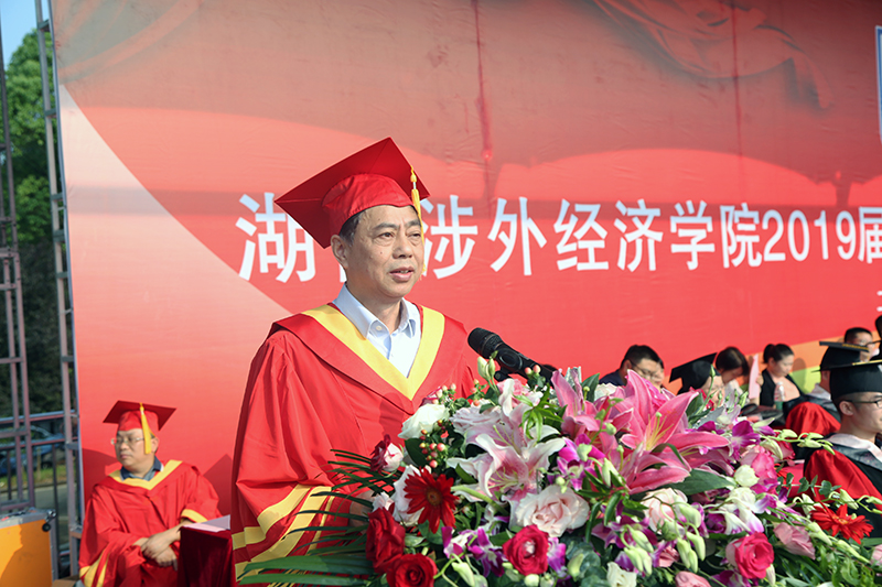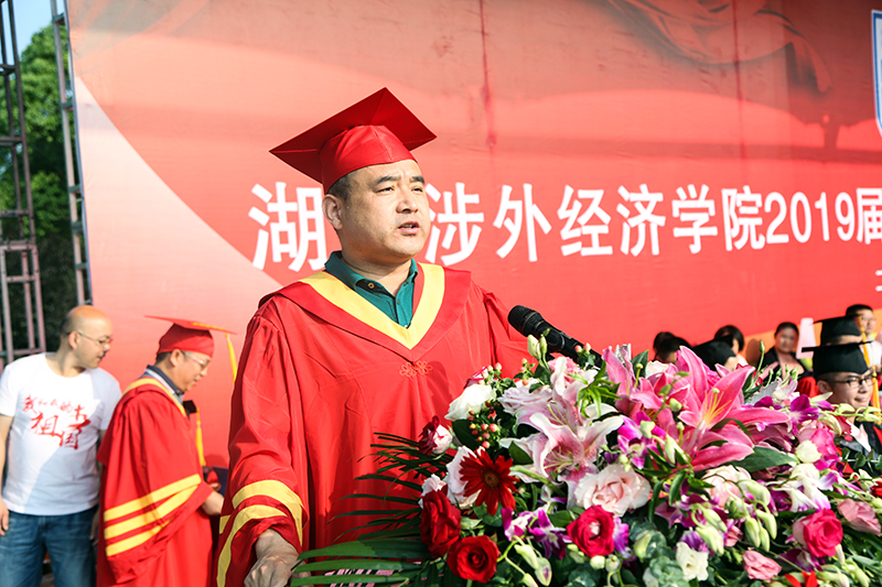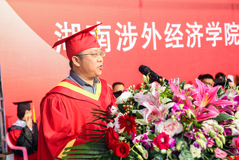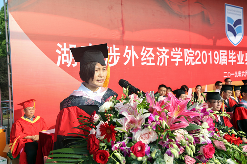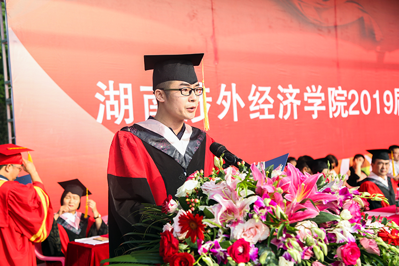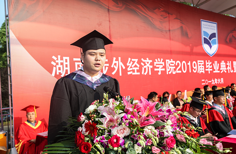 从录取通知书到毕业典礼,只有匆匆四年。来自文法学院的毕业生代表肖俊乾向大家讲述了他从懵懂青涩到收获情谊、得到锻炼、学会包容的大学四年,也阐述了他认为大学中最重要的事情——培养出一个独立思考之人格。在发言中,肖俊乾同学表达了对学院领导、辅导员、长辈的感激之情,对同学、朋友的不舍之情,以及即将踏入社会的坚定信心。教师代表商学院陈洁教授发表致辞时也不禁感慨道:“我幸运地见证了你们的青春与蜕变,感谢你们与我分享你们的笑脸、你们的率真。”
