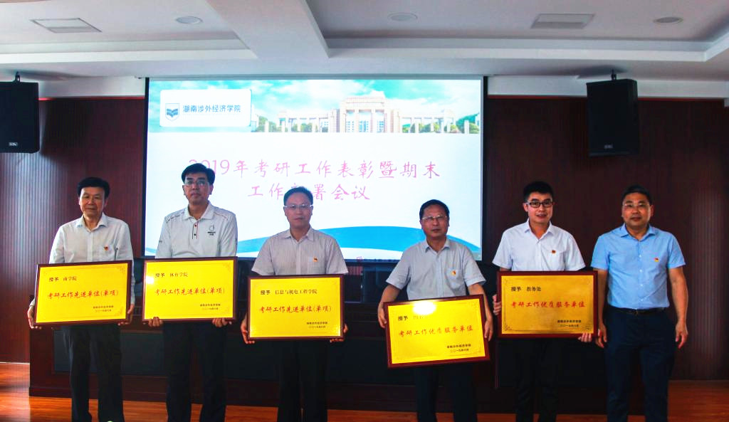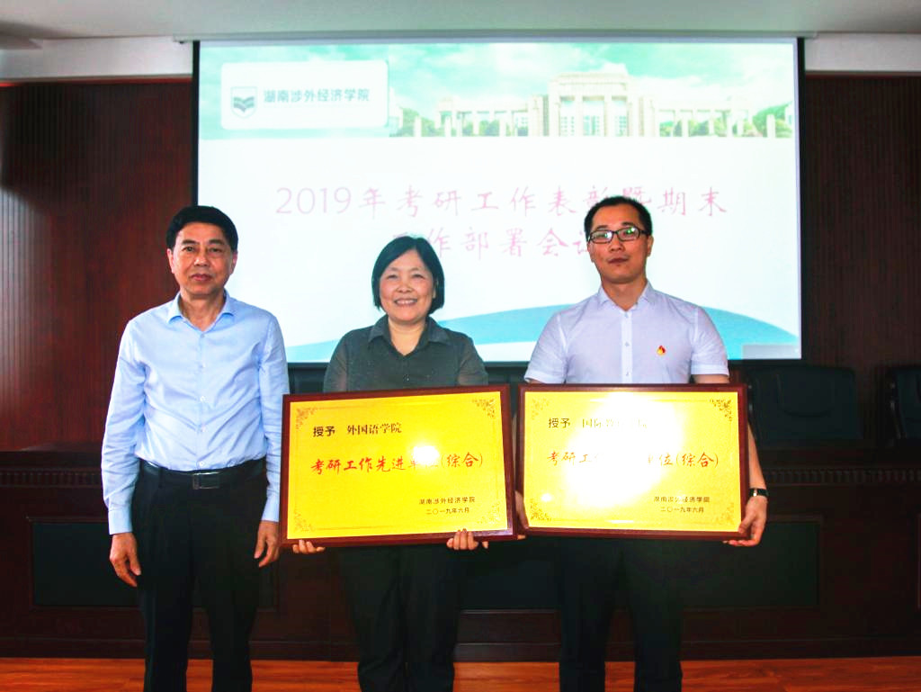 陈斌副校长宣读了《关于表彰2019届考研学生和考研先进工作单位的决定》,在2019年硕士研究生入学考试中,伟德官网应届毕业生积极报考,刻苦学习,努力拼搏,取得了较好成绩,158人考取硕士研究生。其中36名学生被南京大学、中南大学、湖南大学等知名高校录取,52名学生前往英国爱丁堡大学、英国阿伯丁大学等高校攻读硕士学位。为表彰先进,根据《BV伟德官方网站关于引导和鼓励本科生考研的若干意见(试行)》(湘外经院教字〔2018〕50号)的规定,经学校研究决定,对考上“985”、“211”学校研究生及出国(境)攻读硕士学位的88位学生每人奖励2000元,考上其他高校硕士研究生的70位学生每人奖励1000元。授予外国语学院和国际教育学院 “考研工作先进单位(综合)”荣誉,每个单位奖励5000元;授予商学院、体育学院和信息与机电工程学院 “考研工作先进单位(单项)”荣誉,每个单位奖励2000元;授予教务处、图书馆“考研工作优质服务单位”荣誉,每个单位奖励2000元。陈斌副校长代表学校希望获奖的各位学生戒骄戒躁,在新的高校潜心修学,再接再厉,再创辉煌,为学校争光。希望各二级学院及相关职能部门持续加大精力投入,最大力度为考研学生创造良好的条件、提供优质的服务,积极引导广大学生成长成才,不断提高伟德官网人才培养质量。
