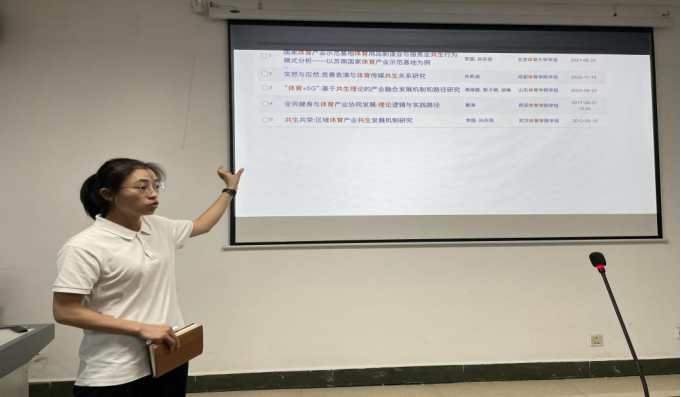 会上,念贵、张淑惠、宋靓雯等八位老师借助ppt多媒体演示,在规定时间内,简洁明了地展示自己的研习成果,并进行为时10分钟的汇报,从各自研究领域与大家分享其选题思路、研究方法以及研究结果等。本次专题分享会均是湖南省第十二届大学生运动会科学大会获奖论文,所研究内容推陈出新,涉及到体育的众多领域,充分表现出研究的广泛性、时代性、指导性和实践性。