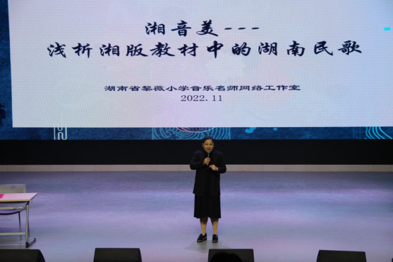 《湖南民歌研习》为省级一流艺术类社会实践课程,为体现课程教学特色,多元化教师授课模式,11月3日晚,伟德官网音乐学院邀请到了湖南黎薇小学音乐名师网络工作室首席名师,长沙市首批、第四批卓越教师黎薇,为音乐学院2019级同学们开展专题讲座:《湘音美——浅析湘版教材中的湖南民歌》。该课程将原有的分班分教室授课模式换为11个班线上线下混合式授课,活动过程严格按照疫情防控要求开展。