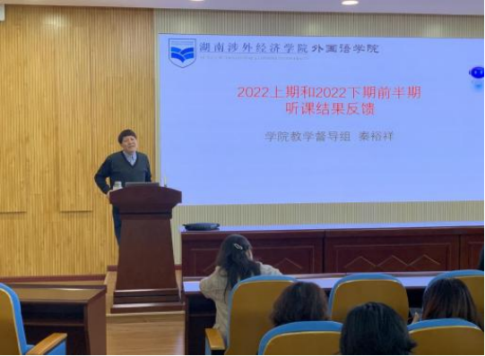 紧接着,学院教学督导组组长秦裕祥教授对2022上学期和2022下学期前半期听课结果进行反馈。秦教授认为,两个学期97.69%和82.61%的优良率体现了我院老师的教学水平较好,随后他又详细列举了听课中发现的优点和不足之处,并强调老师上好课至少要具备四个条件:一是端正的教学态度,二是扎实的专业功底,三是精心的顶层设计,四是高超的课堂驾驭。然后,秦教授提出了开展问题推进式课堂教学的改进建议,并就为什么开展问题推进式课堂教学和如何开展做了理论上的阐述,并辅以例证说明。采用问题推进式课堂教学大有裨益,因为它既符合学生学习知识这一学习过程的认知规律,又可以提高学生的学习兴趣和课堂教学效果,培养学生的思维方式和提高学生思维能力;也有助于老师提高教案撰写水平、教学水平和科研水平。