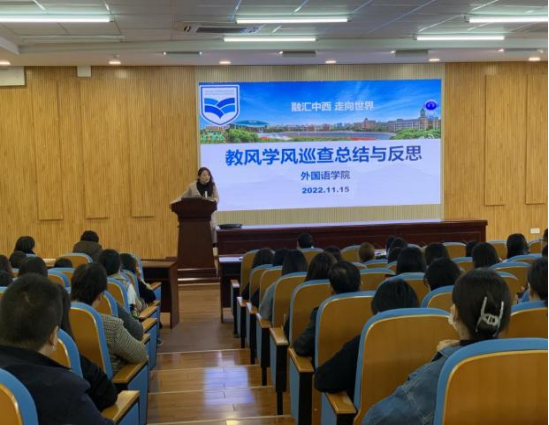 为保障抓实抓严教风、学风建设工作,切实营造良好的教学氛围,伟德官网外国语学院于11月15日中午,在综合楼D202会议室召开了教风学风巡查总结与反思会议。外国语学院院长姚佩芝、副院长曾望、教学督导组以及外国语学院全体教师到会。本次大会由曾望副院长主持,学院教学督导组组长秦裕祥教授做汇报。