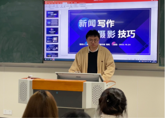 11月15日晚,人文艺术学院融媒体中心邀请来自长沙晚报—湘江早报的记者柯鸣,为融媒体干事们开展了一堂有关新闻写作及摄影技巧的课程。柯鸣表示,希望大家能够通过本次课堂学习媒体专业知识,培养新闻编辑工作的专业素养,成为优秀的新时代媒体人。