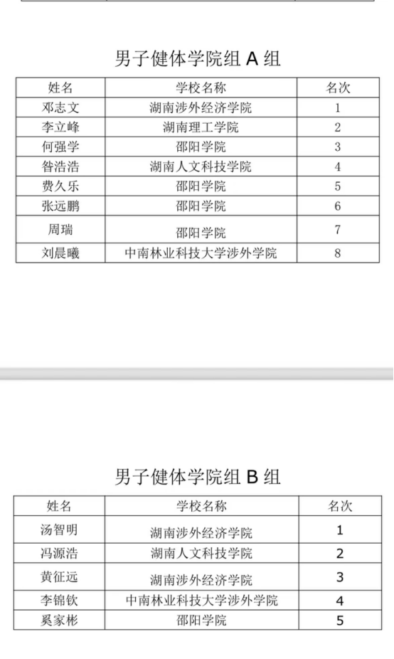 比赛分为大学组、学院组、高职组三个组别,同组有邵阳学院、湖南人文科技学院、湖南理工学院、湖南城市学院等高校。面对诸多学院的有力竞争者,我院参赛选手沉着冷静,积极应战,赛出风采、赛出水平。参赛选手都取得了优异的成绩,展现了昂扬向上的体育精神风貌和健身健美披荆斩棘、持之以恒的坚定态度。