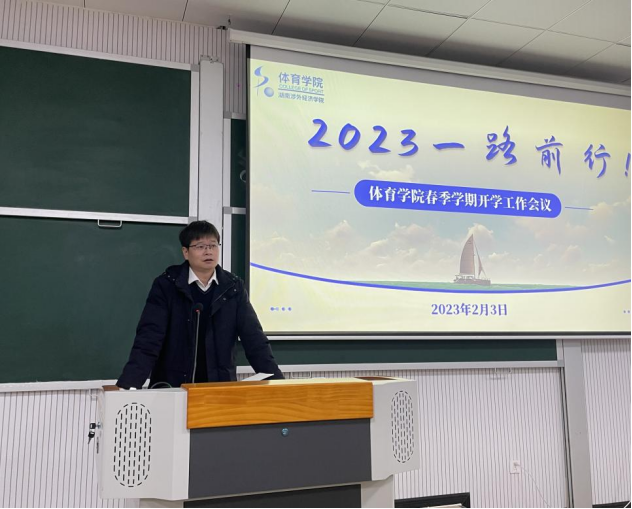 2023年2月3日上午,体育学院于六教213阶梯教室召开“2023一路前行”春季学期开学工作会议,副校长汪东明、招生就业处长涂乃天出席本次会议,会议由体育学院党总支书记王治国主持,全体教职工参会。
