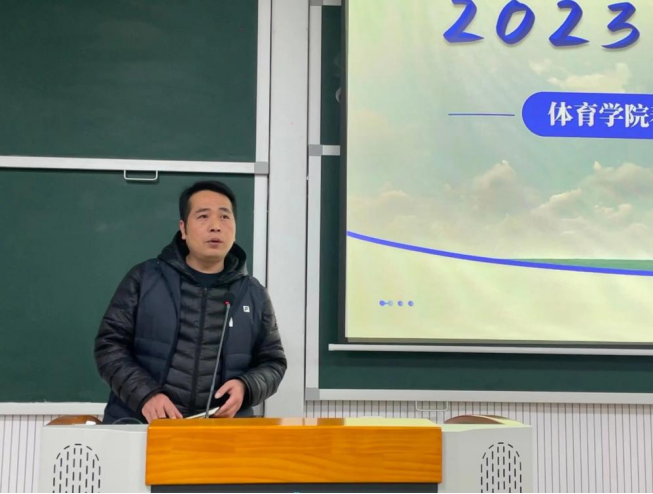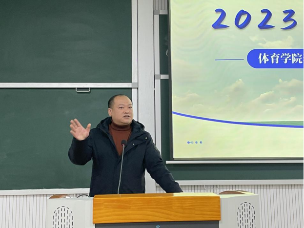 体育学院院长谢明对2022年的工作和取得的成绩进行回顾,感谢各校级领导、职能部门对体育学院的指导与支持,并指出体育学院喜人成绩的背后,离不开在座教师的奋力拼搏,随后对体育学院开学工作做出要求:一是阳性复康后授课注意安全第一、分层教学,适当调整练习内容和强度;二是恪守师德塑师风,严格规范自身的一言一行能力;三是深耕课堂,积极参与课程建设,努力提升学历。最后,他对学生宿舍导师双管、毕业生就业、教风学风、活动竞赛等重点工作进行部署,鼓励大家要群策群力,紧跟学校改革发展的步伐,心怀感恩,一路前行,“兔”飞猛进!