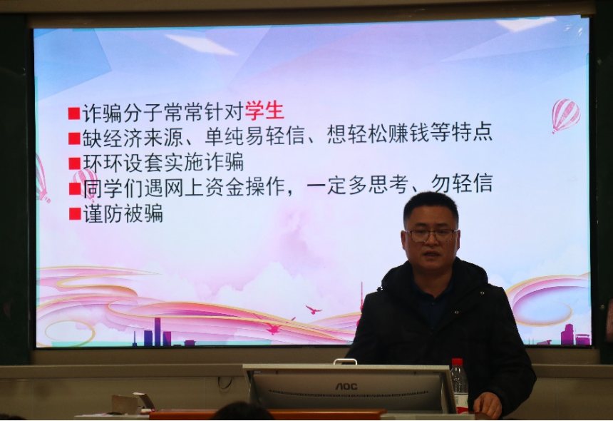 宣讲会主要从电信诈骗主要类型、诈骗案例、手段以及如何预防电信诈骗等内容展开介绍,陈波老师为学生们介绍了电信诈骗的种类,并结合近期发生的几起校园电信诈骗案件,阐述了电信诈骗案件发生的因素,发生电信诈骗后应该采取的有效措施,以及如何预防电信诈骗,并与同学们展开了分享,通过结合学生身边发生的事情,来详细有效地传播了电信诈骗的危害与措施,学生们也积极地展开了讨论,强化了宣讲会的力度。