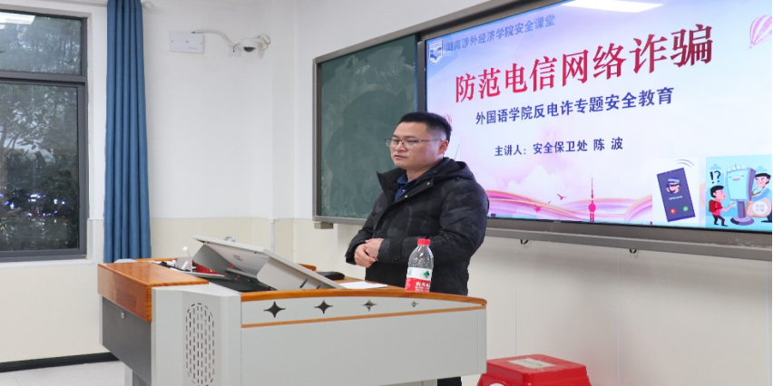 学校安全保卫处陈波,外国语学院党总支书记尹理智、安全专干薛勇以及大一至大三各班班长参加本次宣讲会。