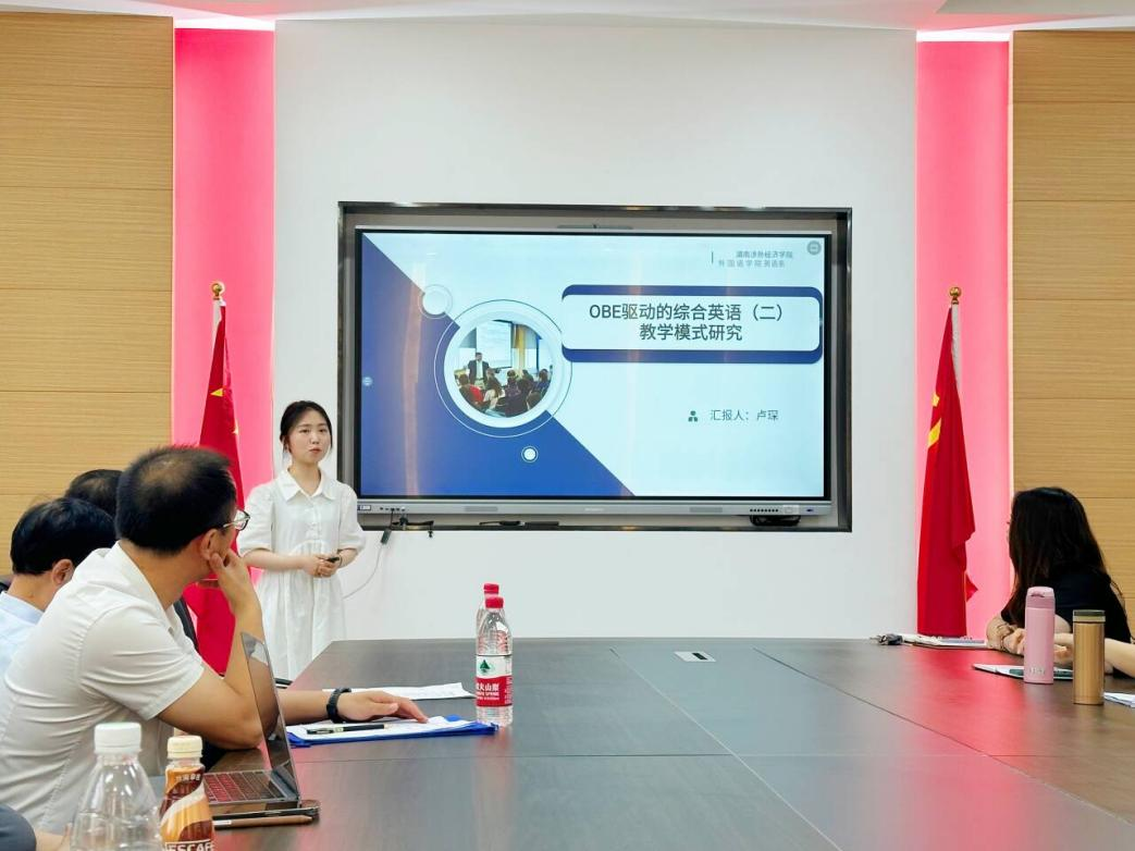 活动中,综合英语(二)课程组的罗蓓和卢琛两位教师做主题发言。两位老师首先对课程做了介绍,然后对OBE理念的内涵、OBE理念指导下综合英语(二)课程的教学创新与实践进行了评细阐述,最后结合具体案例分析了OBE理念驱动下《综合英语(二)》课程的教学模式、教学方法和教学评价方式的改革实践。随后,英语写作课程组的艾伟伟老师、汉英笔译课程组的文岚老师也结合自己的教学进行了交流。