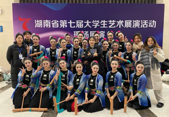 同时,《槌听侗音》作为音乐学院舞蹈学专业师生精心打造的原创作品,既是课堂衍生作品,也是教师与学生共同智慧的创新成果。该作品曾入围首届全国民族民间舞蹈创作汇演,获2021-2022年湖南省优秀舞蹈作品,参与湖南省高校民族民间舞教学经验交流研讨会,荣获第九届湖南省青年艺术节金奖;湖南省第七届大学生艺术展演专业乙组一等奖;第十七届北京市舞蹈大赛创作、表演三等奖等。并在广西民族大学、华南师范大学、陕西师范大学、吉首大学张家界学院等高校毕业晚会中成为学习剧目展演,得到外界同行对于作品的肯定。
