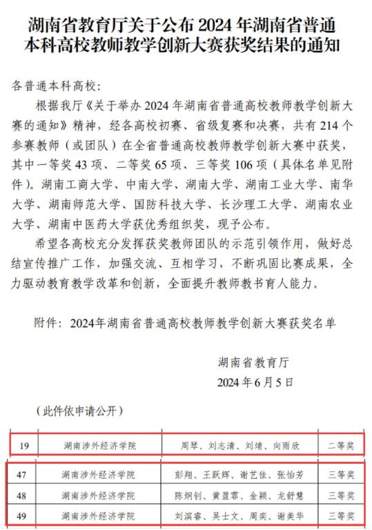 近日,湖南省教育厅主办的第四届普通高校教师教学创新大赛落下帷幕,伟德官网教师在这场全省范围内的教学盛事中大放异彩,四个参赛团队共斩获一个二等奖、三个三等奖的优异成绩,为伟德官网的教学创新工作再添新篇章。