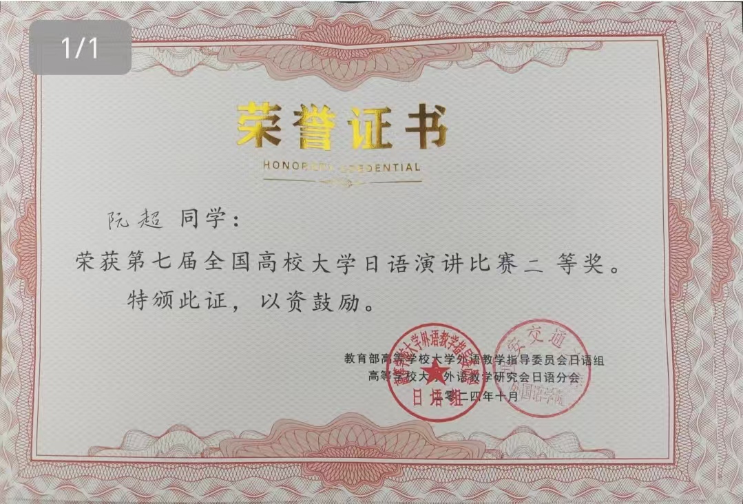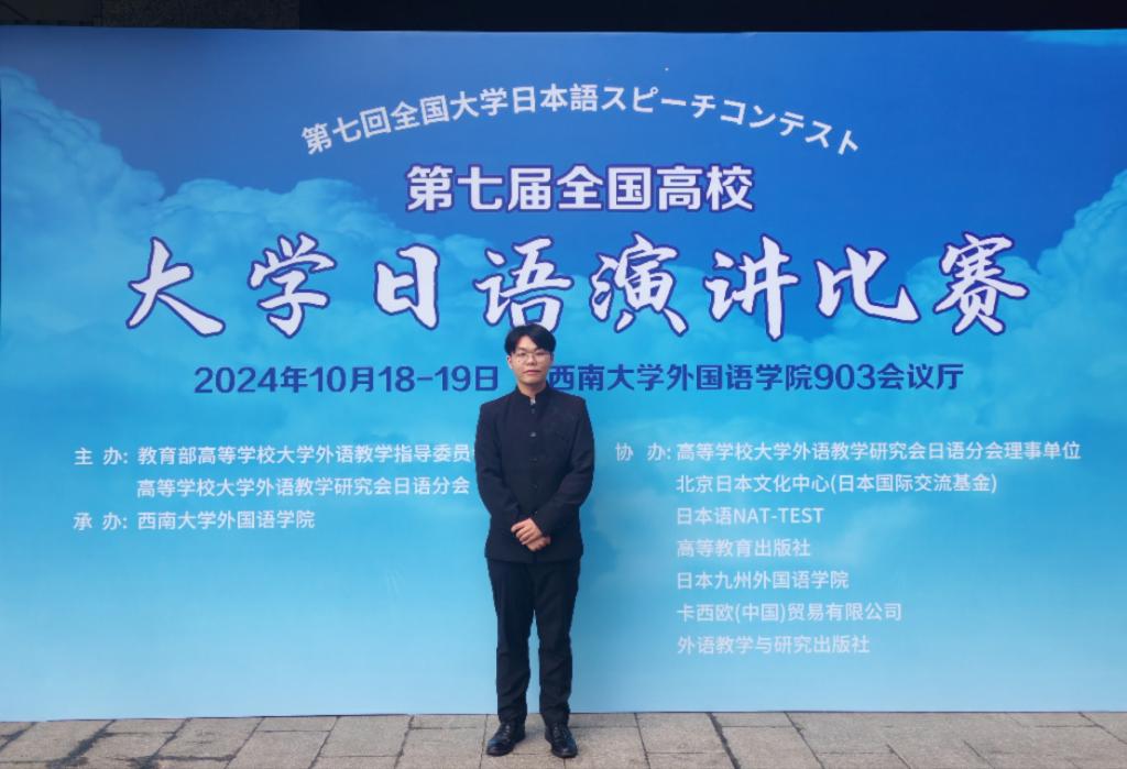 10月19日,第七届全国高校大学日语演讲比赛在西南大学圆满落幕。伟德官网大学日语5班学生阮超(网络与新媒体2301班)在外国语与国际教育学院日语专业朱婷、陈娟两位老师的指导下,荣获全国二等奖的优异成绩。