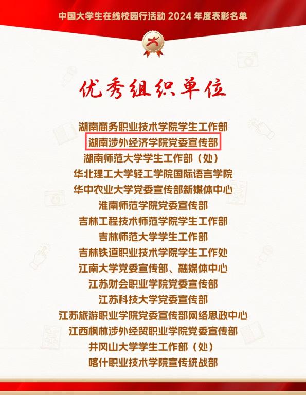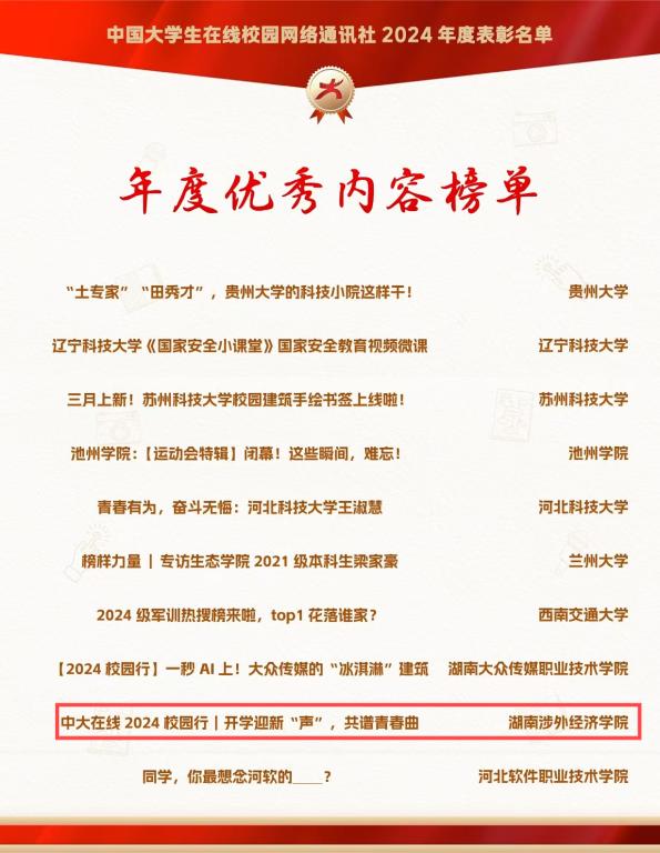 在2024年度中国大学生在线校网通及校园行表彰活动中,伟德官网喜获多项荣誉。BV伟德官方网站党委宣传部获“优秀组织单位”,易班发展中心获“优秀校网通站”;黄振老师获“校网通优秀指导教师”和“校园行新星指导老师”;潘府莹同学获“优秀学生编辑”,推文《开学迎新“声”, 共谱青春曲》入选“年度优秀内容榜单”。