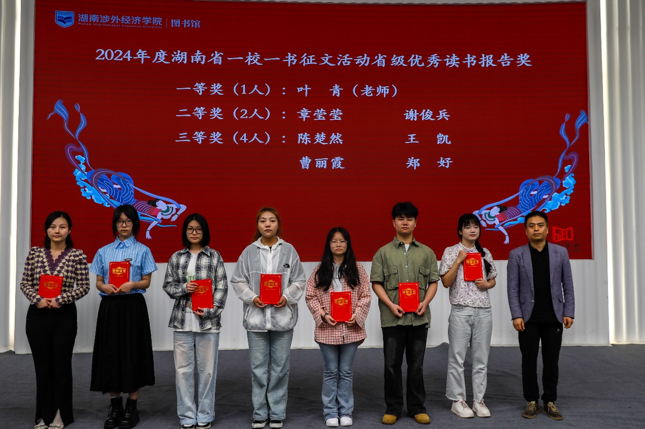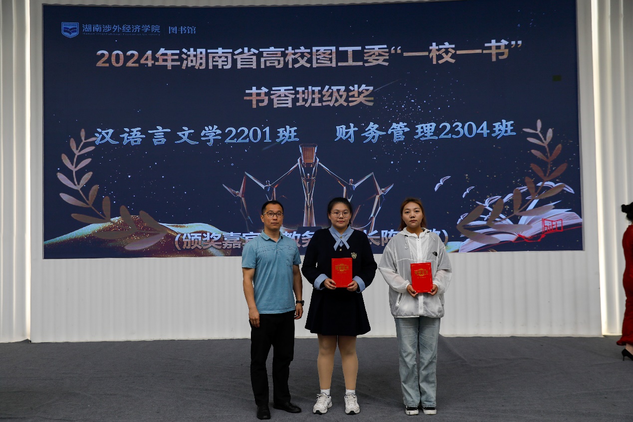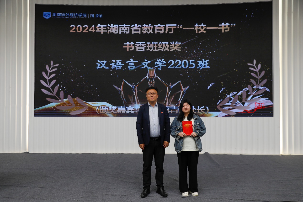 会上,学生工作处处长贾青彦、教务处处长陈善敏、图书馆馆长王昊等人分别为2024年度“书香涉外”系列读书活动中表现突出的典型进行优秀表彰,同时还为在2024年度湖南省“一校一书”阅读推广活动获奖集体和个人进行了颁奖与表彰。