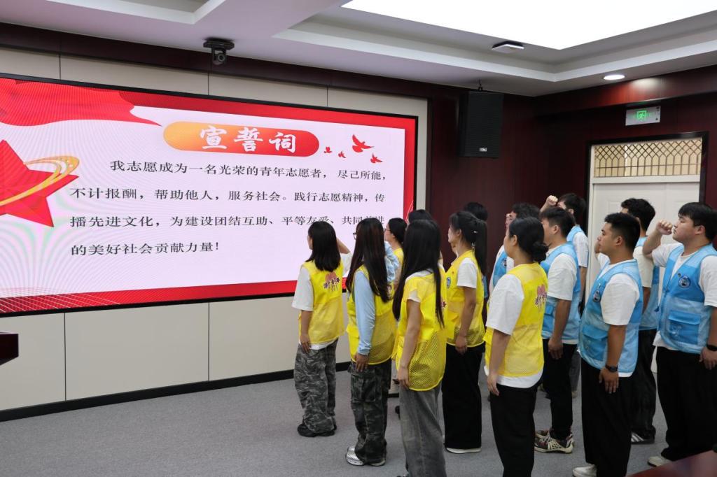 随后,全体志愿者肃然起立,在领誓人的带领下,面向鲜红的旗帜,紧握右拳进行集体宣誓。授旗仪式上,汪东明副校长将“BV伟德官方网站西部计划志愿服务队”队旗授予志愿者团长李道光。挥舞的旗帜承载着学校的嘱托,也为志愿者们指引前行的方向。