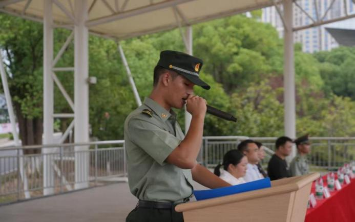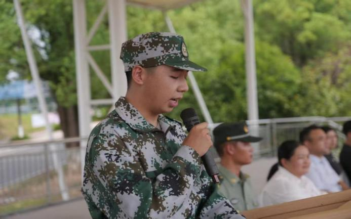 二营一连胥哲议作为新生代表发言,他代表全体2025级新生向学校、教官与老师的精心筹备表示感谢,并表示军训是大学生活的重要开端,不仅能锻炼体能,更是一次精神洗礼。全体新生将以教官为榜样,服从指挥、团结同学,用汗水展现涉外学子的青春风采,并将军训中收获的品质融入未来学习与生活。