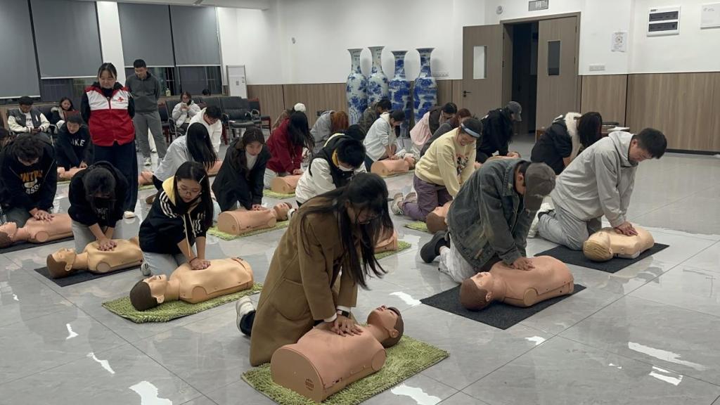 实操环节气氛热烈,学生在模拟人及AED教学设备上反复练习。讲师逐一纠正动作细节,强调“手臂伸直、利用身体发力”“海姆立克法定位精准”等关键点,让抽象知识转化为肌肉记忆。参与同学坦言:“实战演练让我真正有了应对突发情况的底气。”
